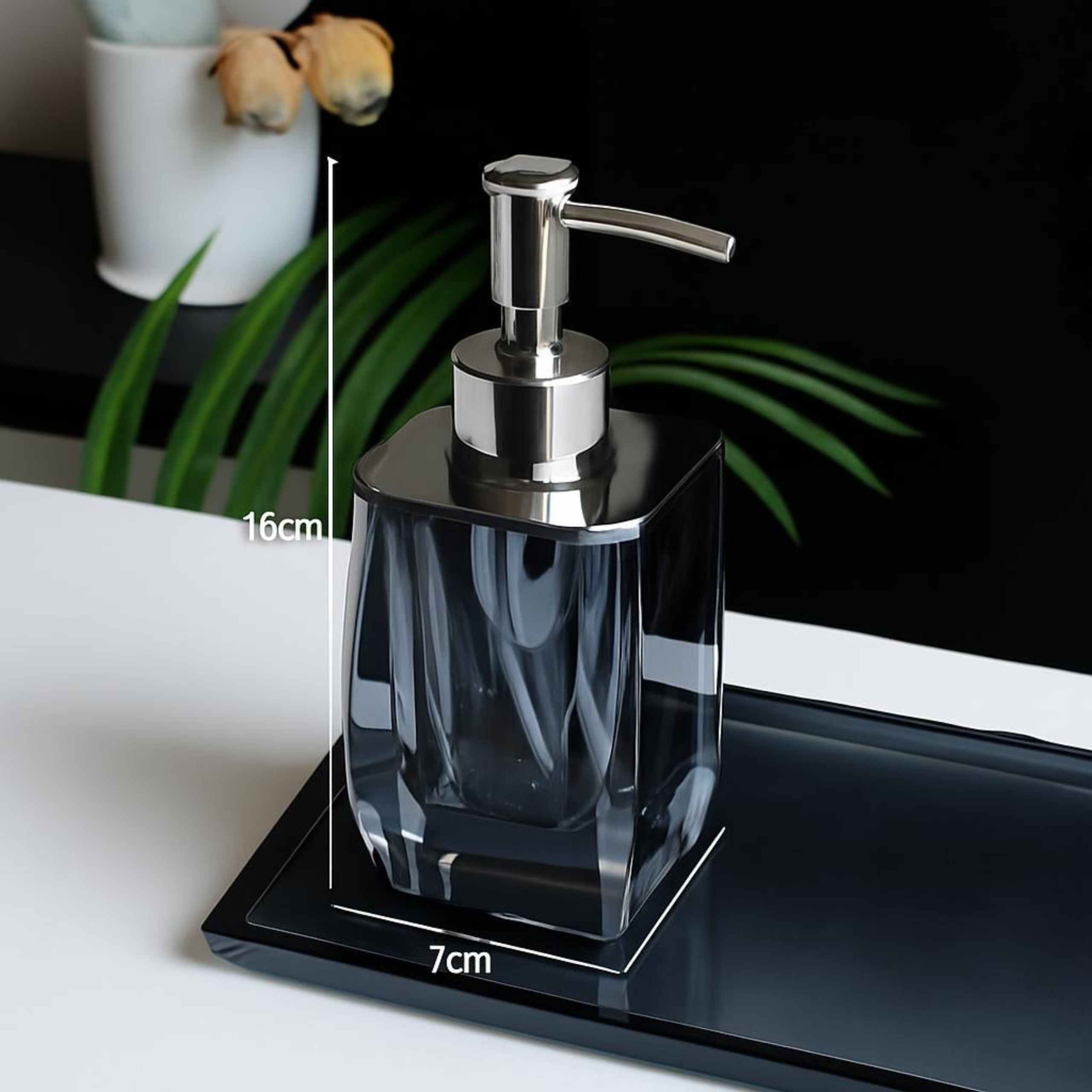 Dispenserul de săpun lichid Havona, realizat din cristal de un albastru închis are dimensiunile de 16×7 cm. Nu doar că este practic, dar este și un obiect decorativ ce va impresiona orice musafir.