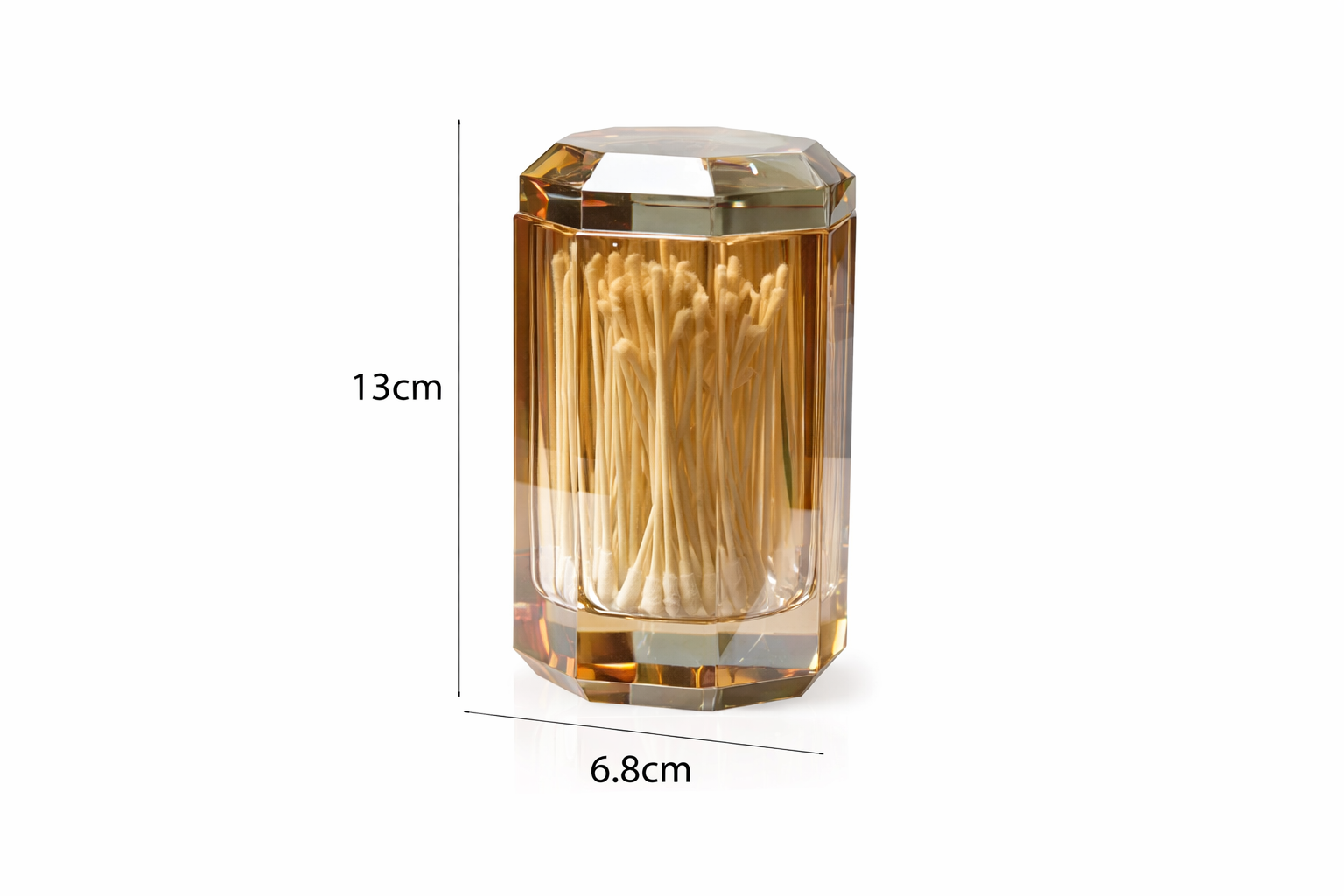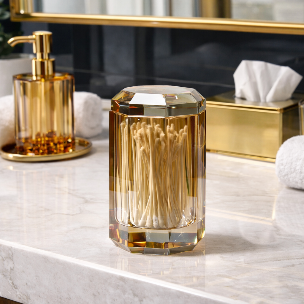 Forma cilindrica si capacul decorativ protejeaza continutul de praf si umezeala, mentinand produsele de igiena curate si organizate. Datorita designului sau transparent auriu, recipientul reflecta lumina intr-un mod elegant si se integreaza perfect in bai moderne, hoteluri sau spa-uri.