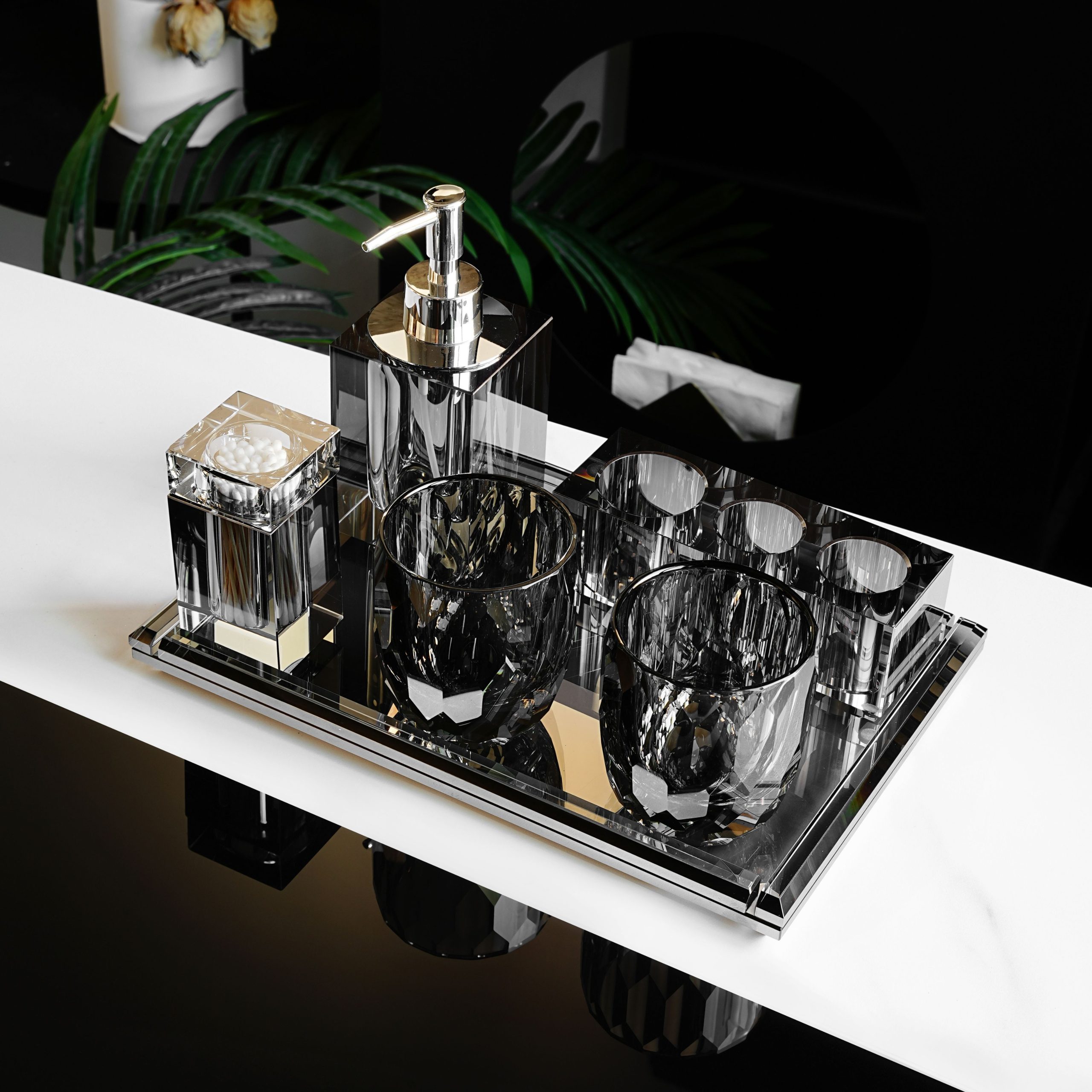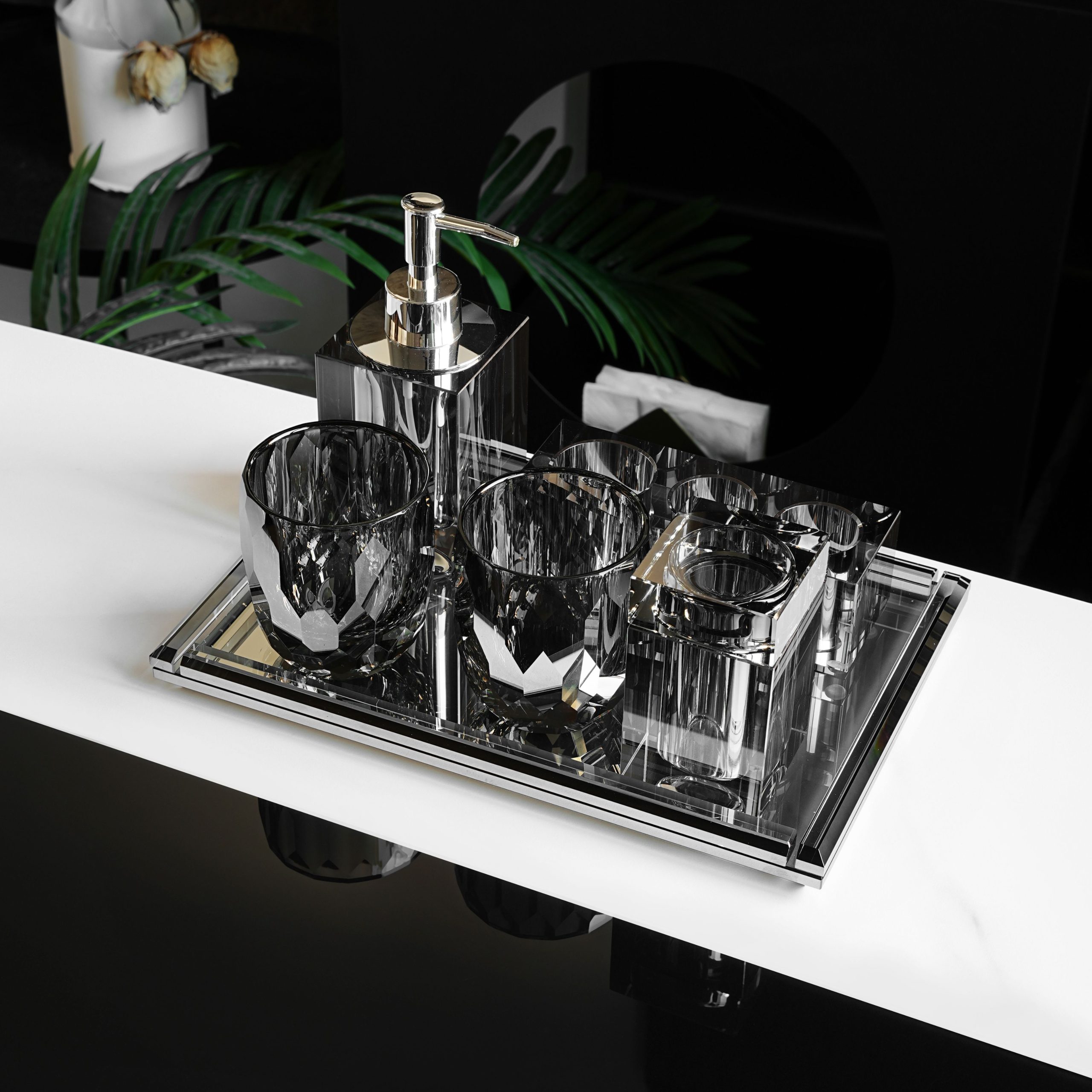Baia dumneavoastră, un spațiu elegant și bine organizat cu Setul de 6 accesorii de baie, gri-ash, din cristal, de la Havona. Acest set sofisticat include un dispenser pentru săpun lichid, două pahare, un suport pentru bețișoare de ureche, un suport cu 3 sloturi pentru periuțe de dinți sau produse cosmetice și o tavă elegantă, toate realizate din cristal de calitate superioară.