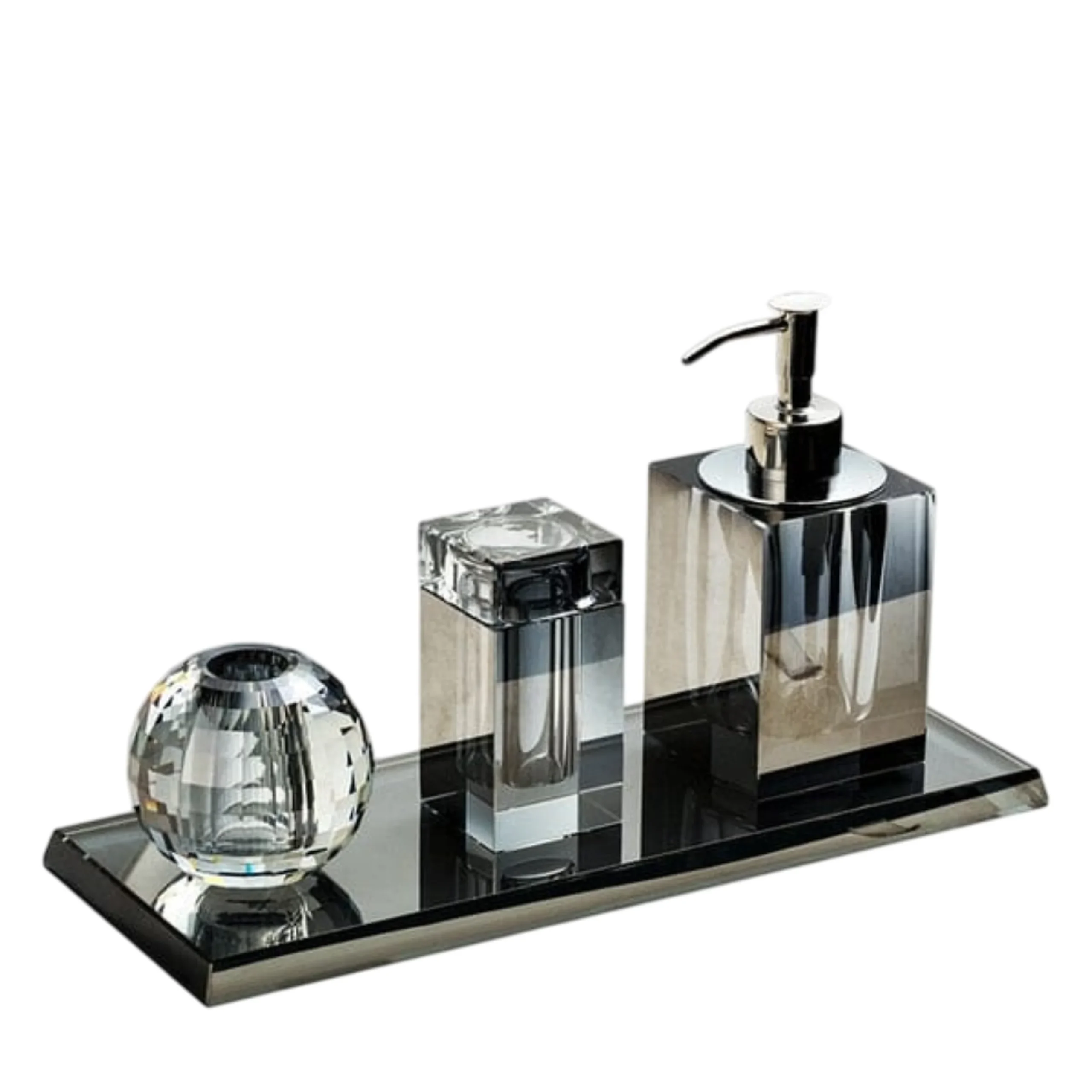 Un strop de eleganță și organizare în baia ta cu Setul de 4 accesorii pentru baie, culoare gri ash, din cristal. Acest set este creat pentru a îmbina funcționalitatea cu un design modern.