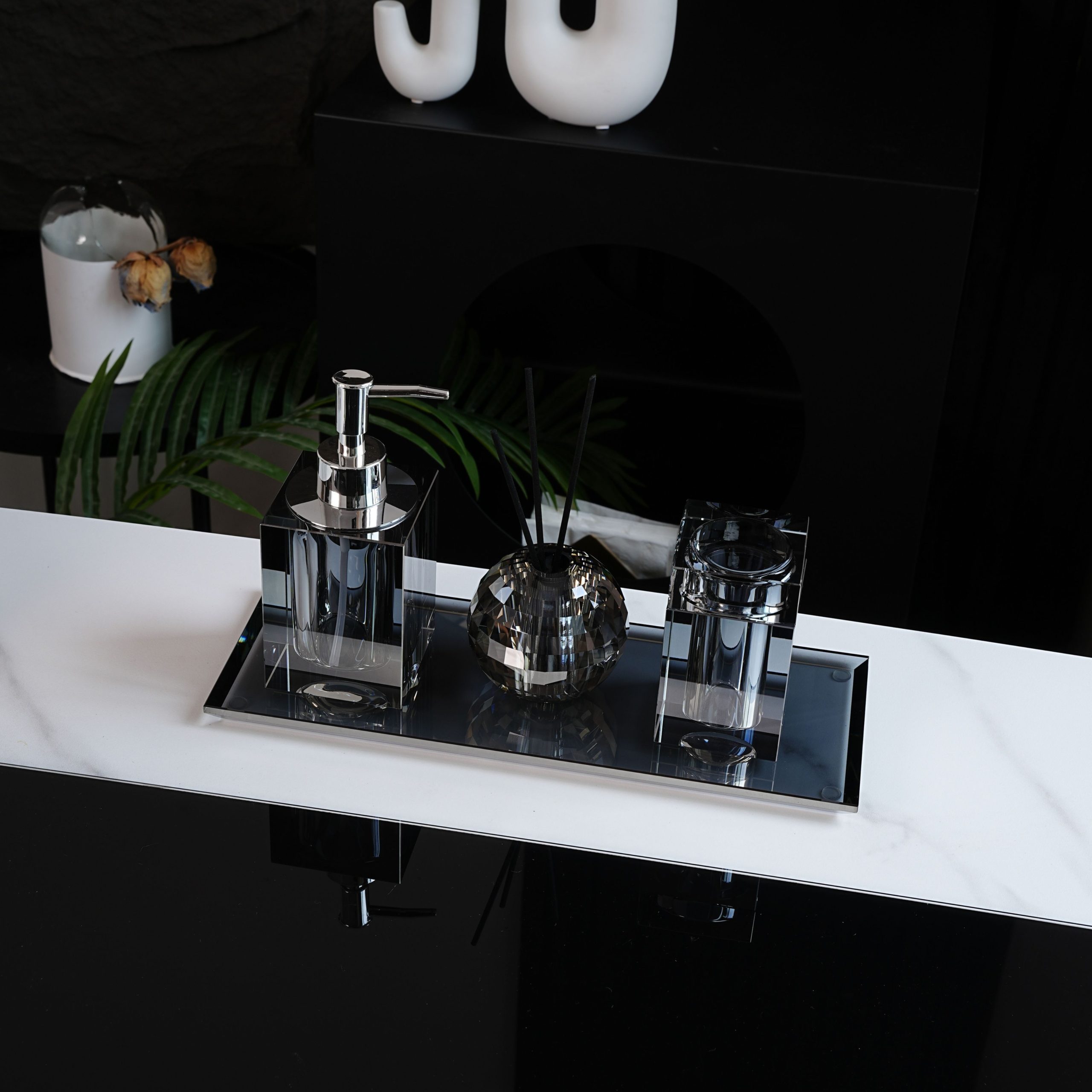 - Setul include: un dispenser pentru săpun lichid, un suport pentru bețișoare parfumate, suport pentru bețișoare de urechi și o tăviță.