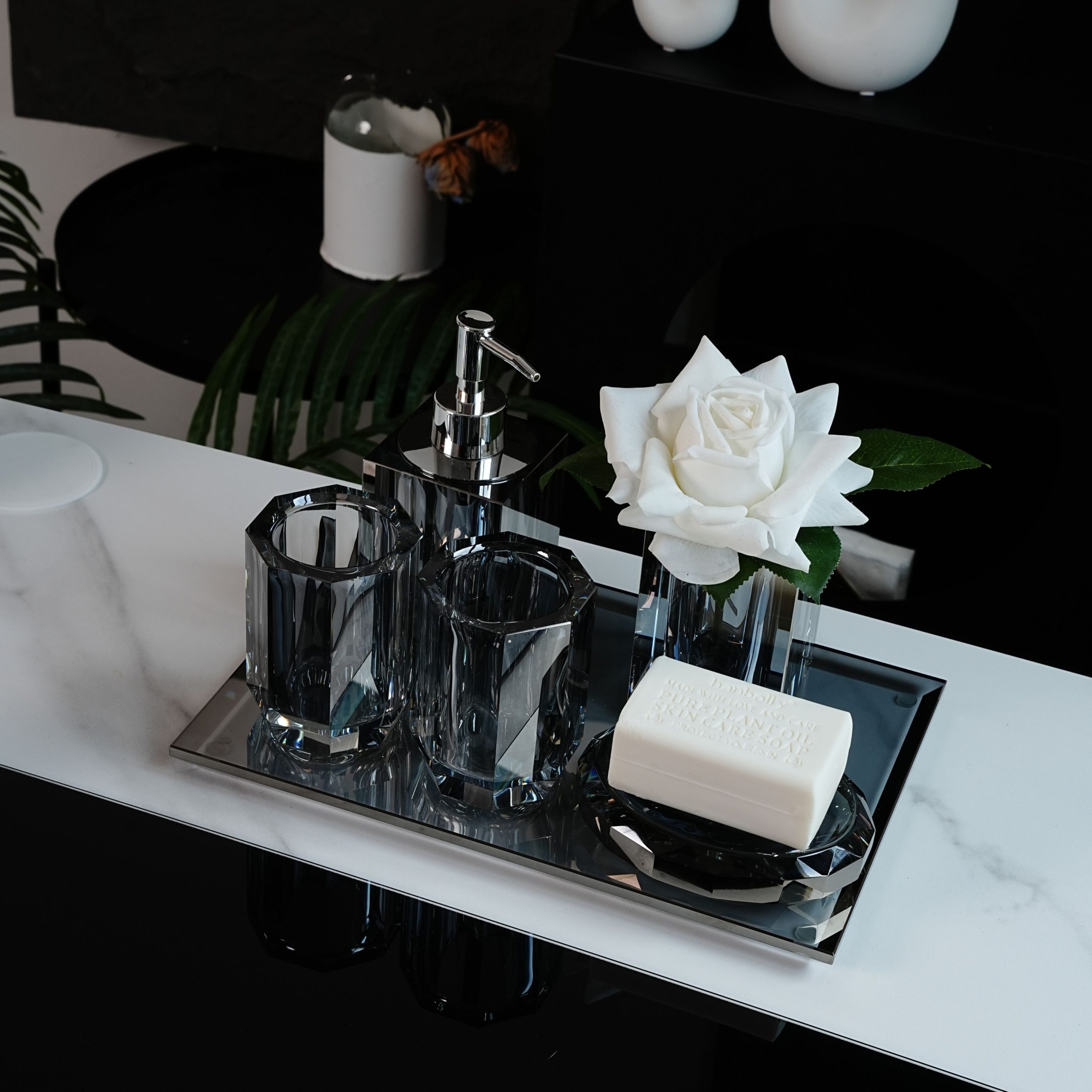 Realizate din cristal, piesele din acest set se remarcă prin designul lor modern și elegant, fiind perfecte pentru orice stil de decor. Culoarea gri-ash conferă un aspect contemporan, făcând din acest set o alegere versatilă pentru a completa orice interior, fie că este vorba despre un spațiu minimalist sau unul mai clasic.
