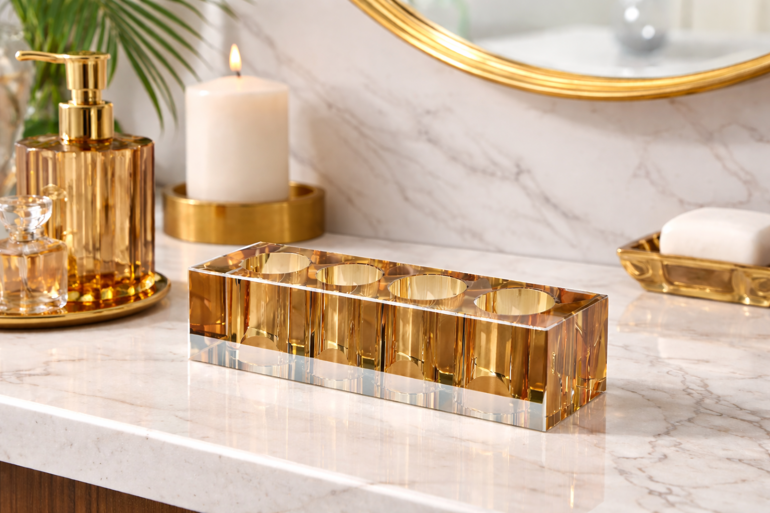 Suport periute dinti cristal auriu combina functionalitatea cu designul decorativ, fiind potrivit pentru bai moderne, hoteluri, spa-uri sau pensiuni. Culoarea aurie transparenta si fatetele tip cristal transforma acest organizator intr-un element decorativ elegant pentru lavoar.
