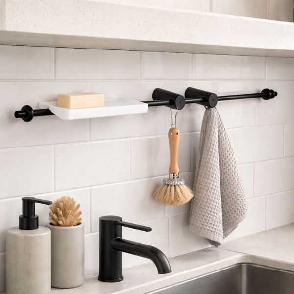 Raftul superior ofera spatiu suplimentar pentru depozitarea produselor de baie sau a accesoriilor, in timp ce bara inferioara este perfecta pentru agatarea prosoapelor. Aceasta combinatie permite organizarea eficienta a spatiului si mentinerea baii ordonate.