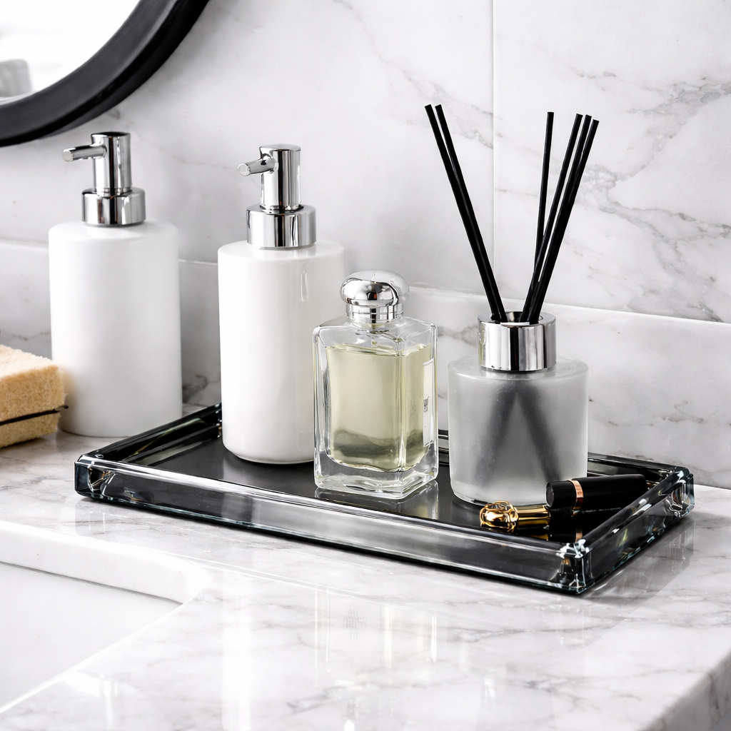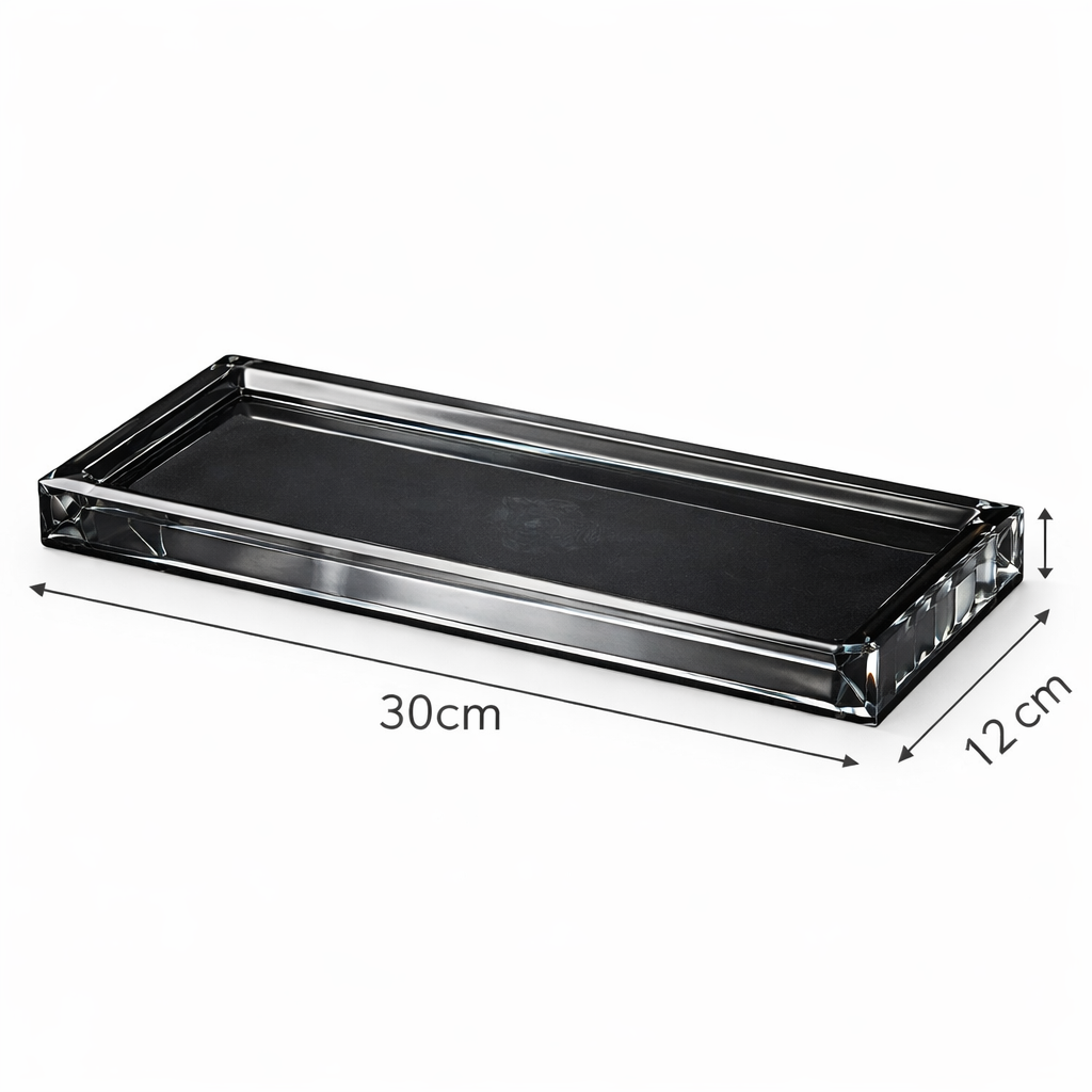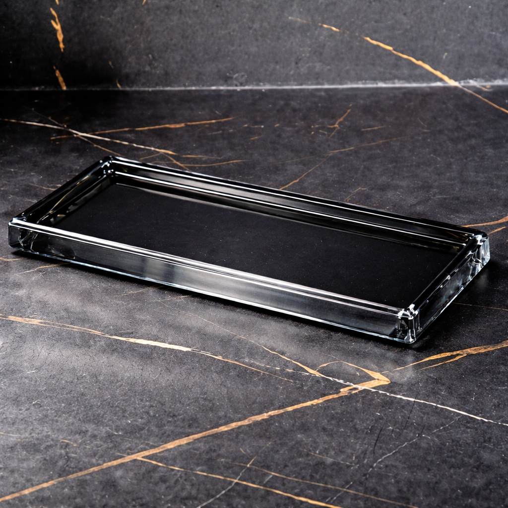 Tava organizator pentru baie din cristal gri fumuriu este conceputa pentru a aduce eleganta si organizare in zona lavoarului. Realizata din cristal decorativ, aceasta reflecta subtil lumina si ofera un aspect premium spatiului de baie.