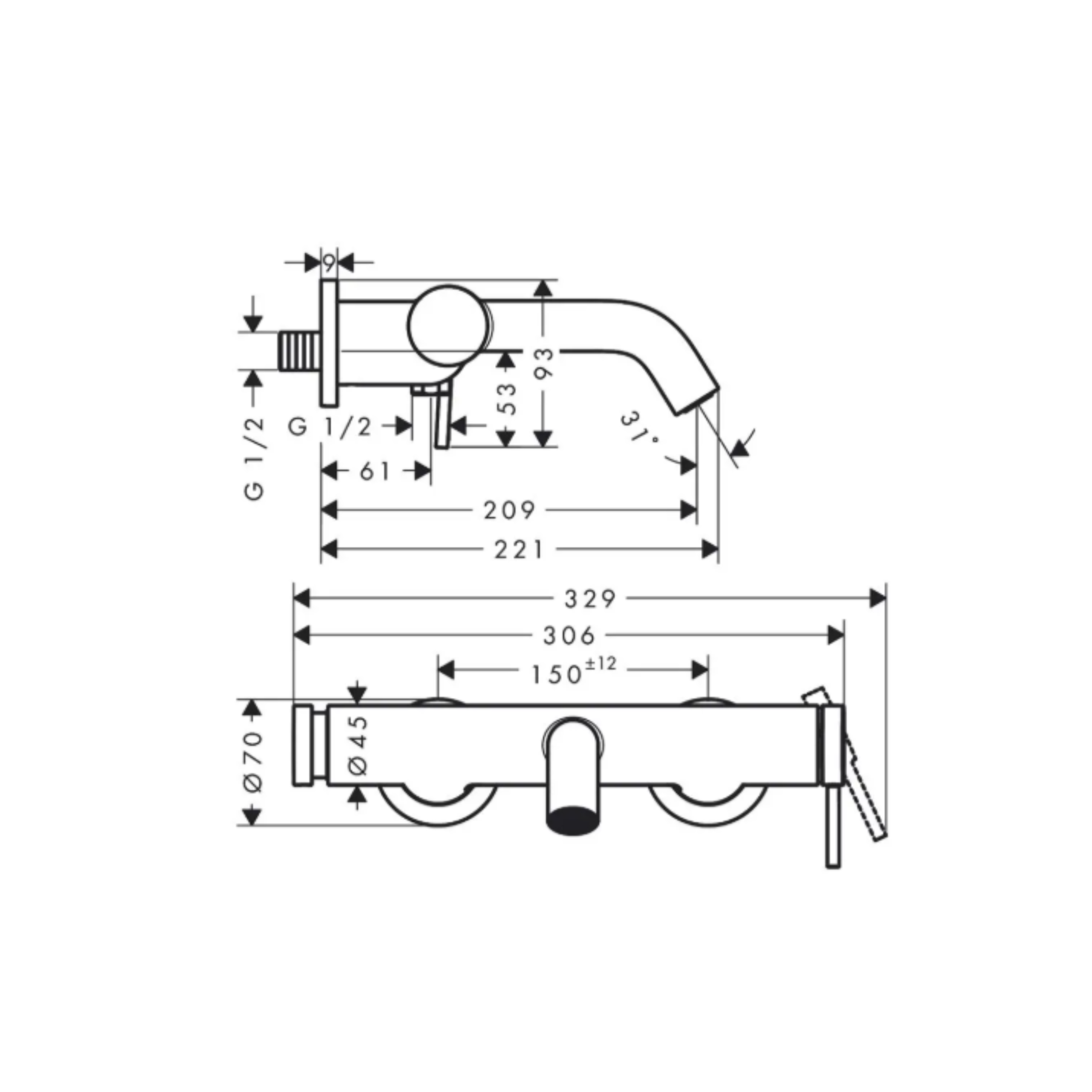 Baterie cada Hansgrohe Tecturis S, crom, montare pe perete, lungime pipă 209 mm, distanța dintre axe 150 mm, control monocomandă, tehnologie AirPower, rozete acoperire circulare, buton Select pentru comutare cadă/duș, debit cadă 21,4 l/min, debit duș 14,7 l/min, cartuș ceramic, conexiune G 1/2″, protecție împotriva refluxului, potrivită pentru boilere.