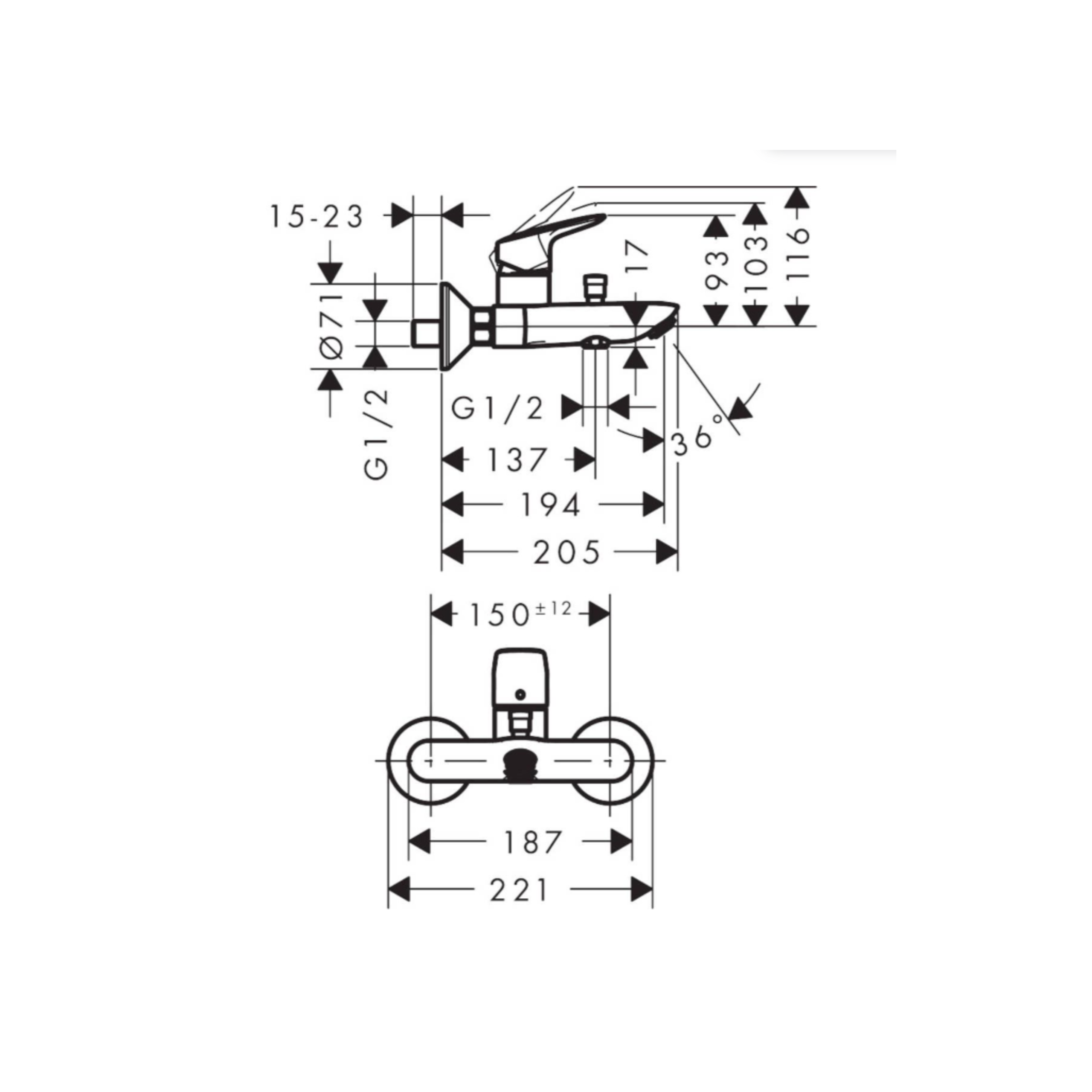 Bateria de cadă-duș Hansgrohe Logis este o soluție elegantă și eficientă pentru băile moderne, proiectată pentru a oferi atât funcționalitate, cât și estetică. Cu o lungime de 194 mm, această baterie se montează pe perete și utilizează conexiuni S, având o spațiere de 150 mm ± 12 mm, ceea ce o face potrivită pentru diverse configurații de instalație.