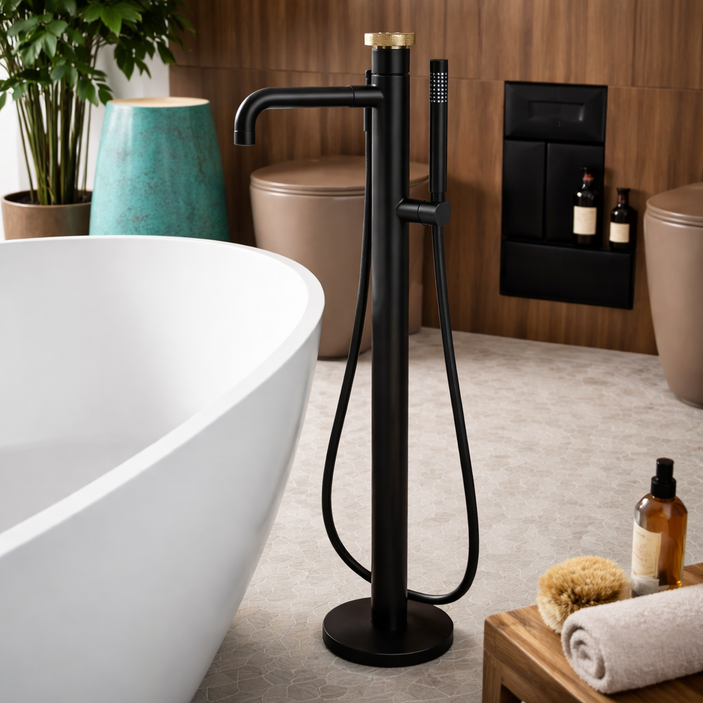 Bateria este prevazuta cu set de dus integrat, oferind flexibilitate si confort in utilizare. Montajul freestanding permite instalarea directa in pardoseala langa cada, fiind ideal pentru baile moderne unde cada freestanding este punctul central al designului.