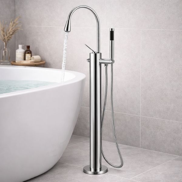 Designul vertical freestanding permite montajul direct pe pardoseala langa cada, oferind libertate in configurarea spatiului din baie. Sistemul include dus de mana cu furtun flexibil, ideal pentru clatire sau curatarea cazii.