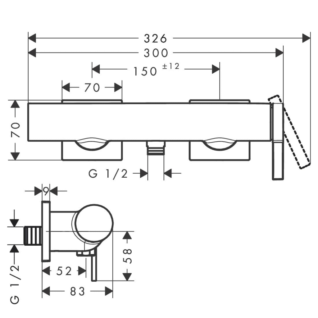 Montajul aparent permite instalarea rapidă și simplă pe instalațiile existente. Bateria are distanța standard între racorduri de 150 mm ± 12 mm, iar conexiunea pentru furtunul de duș este G 1/2. Conexiunile tip S-connections facilitează montajul corect și stabil pe perete.