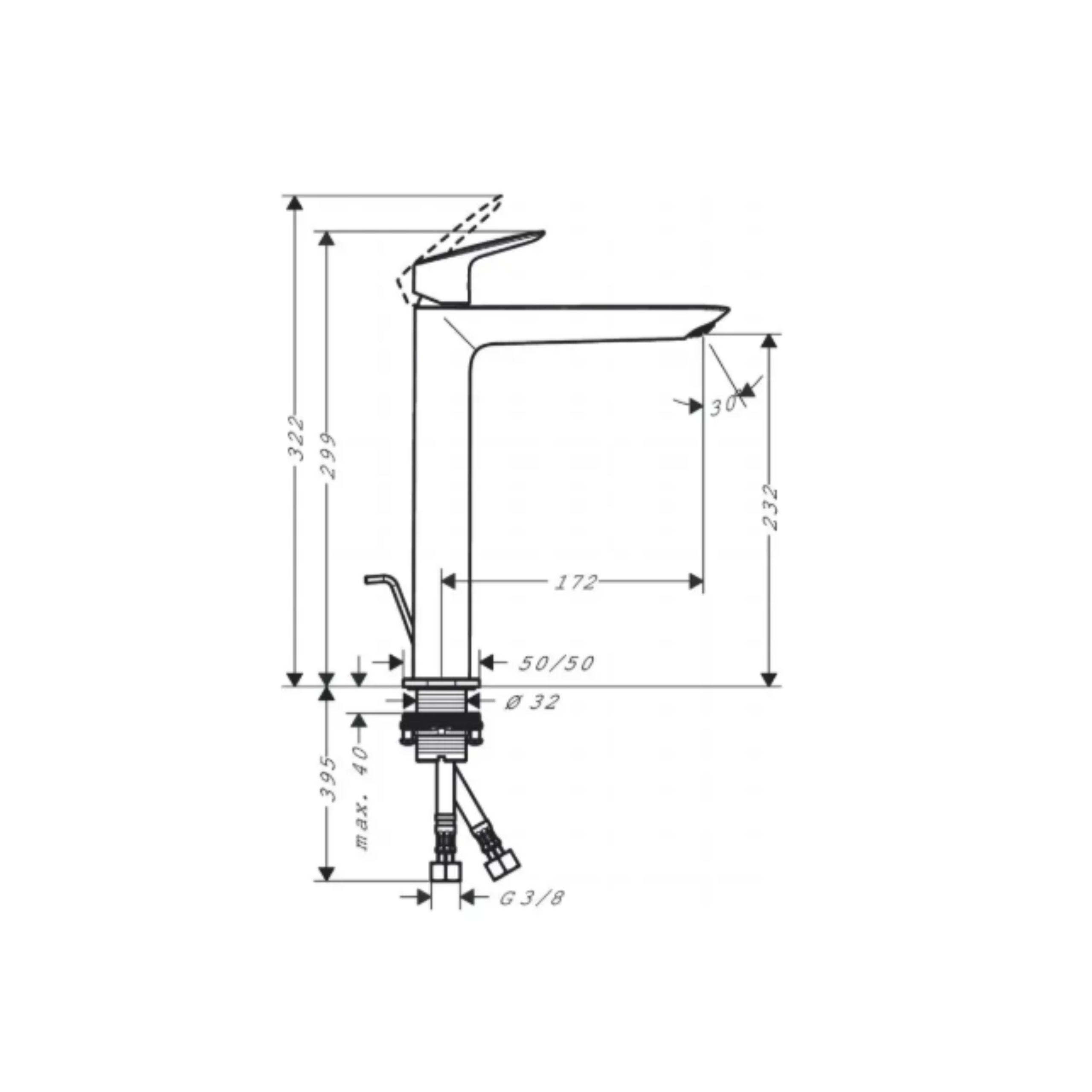 Baterie de lavoar Hansgrohe Logis XL, 240, monocomandă, jet normal, cartuș ceramic, EcoSmart pentru economisirea apei, limitator de temperatură ajustabil, evacuare acționată de tijă. Lungime pipă: 172 mm, înălțime: 322 mm, ComfortZone 232, furtunuri G 3/8, dimensiune conectare DN15, finisaj crom, compatibilă cu boilere, debit maxim 5 l/min (presiune 3 bari).