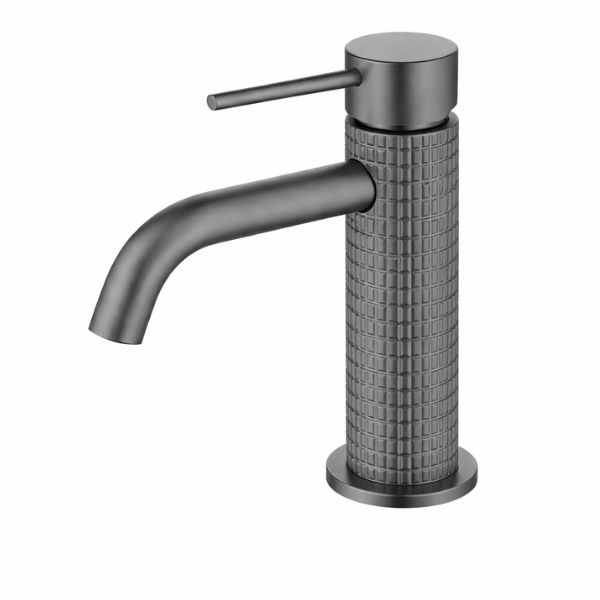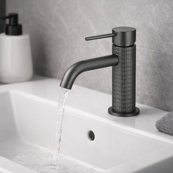 Baterie pentru lavoar cu design modern și finisaj antracit elegant, realizată din alamă durabilă și elemente din oțel inoxidabil. Corpul texturat oferă un aspect premium și o prezență vizuală distinctă, fiind ideală pentru băi contemporane sau minimaliste.
