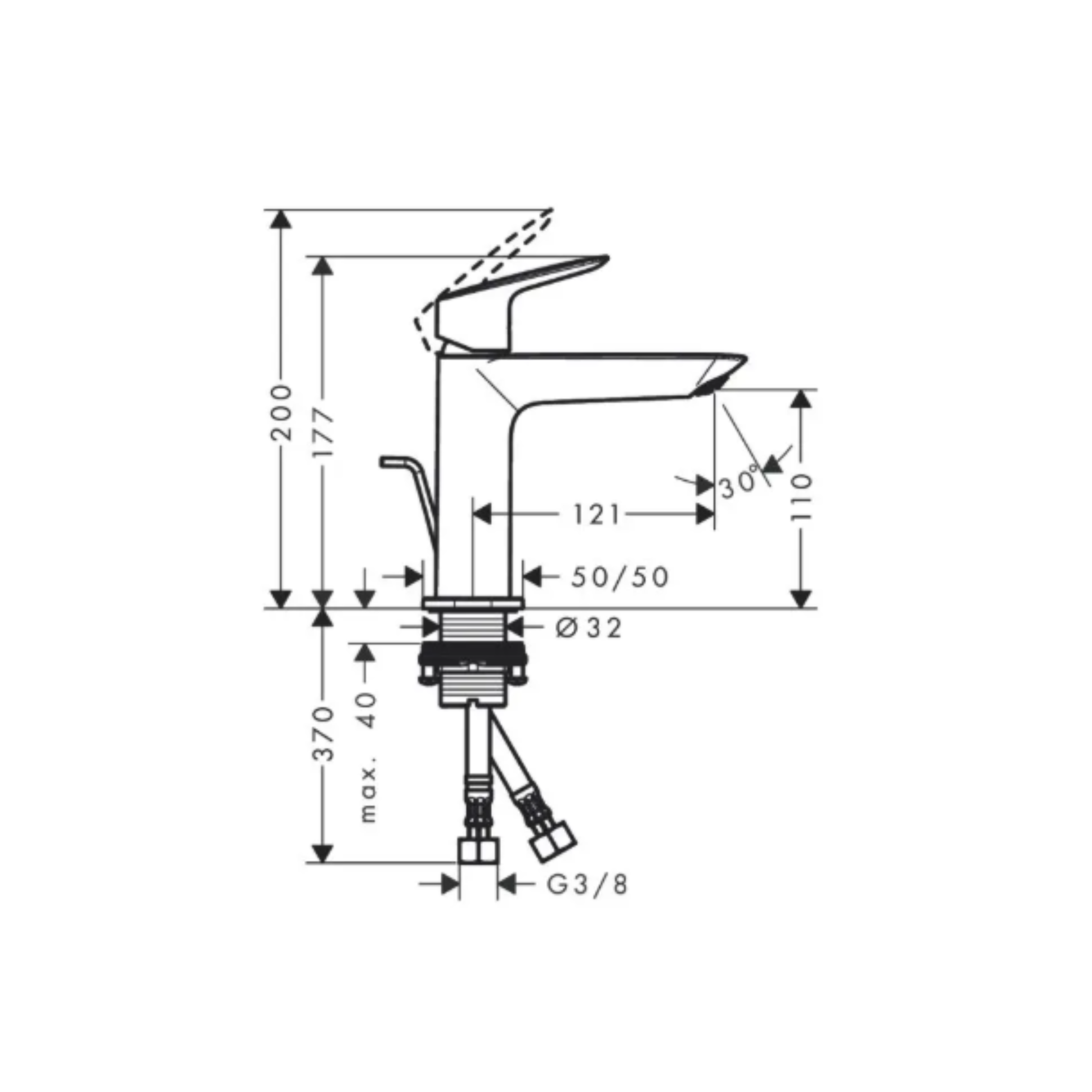 Bateria este echipată cu un mecanism de evacuare acționat de tijă și are o pipă cu o lungime de 121 mm, iar înălțimea totală este de 200 mm, oferind un spațiu generos în zona de utilizare (ComfortZone 110). Conexiunea se realizează prin furtunuri de racordare G 3/8, având o dimensiune de conectare DN15, iar finisajul cromat adaugă un aspect sofisticat. De asemenea, este compatibilă cu boilerele, ceea ce o face o alegere practică pentru diverse configurații de baie.
