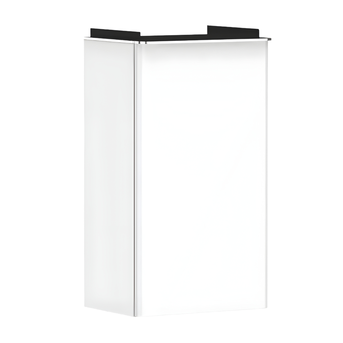 Usa cu balama stanga permite acces facil la spatiul de depozitare. Designul minimalist se potriveste perfect cu lavoarele Hansgrohe din colectia Xelu.