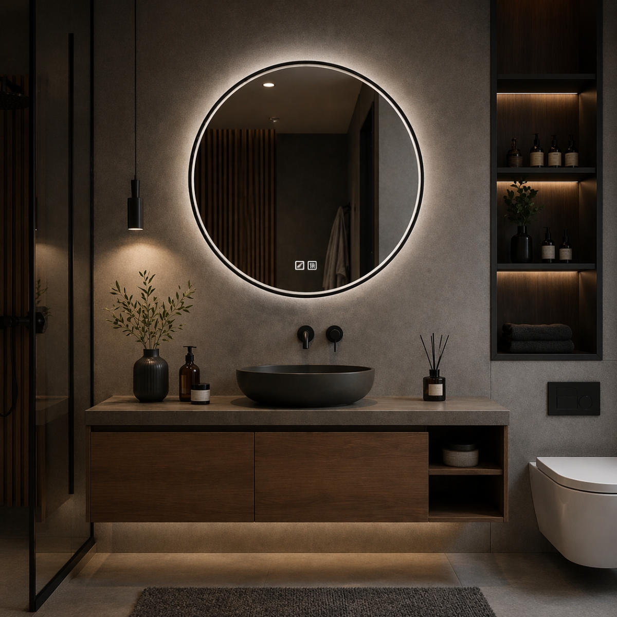 Profilul subțire permite montaj apropiat de perete, ceea ce susține o imagine compactă și ordonată. Forma rotundă funcționează bine în combinație cu lavoare de tip bol sau mobilier cu linii simple, unde este nevoie de echilibru între volum și spațiu liber.