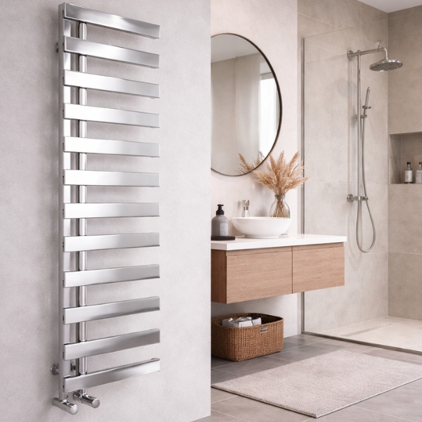 Construcția din oțel asigură durabilitate, rezistență mecanică și performanță termică stabilă în timp. Finisajul cromat lucios oferă un plus de eleganță și protecție împotriva coroziunii, fiind ideal pentru mediul umed din baie.