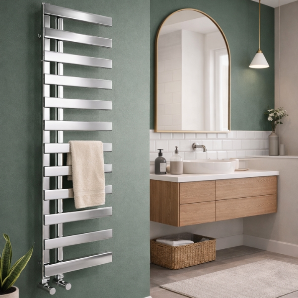 Radiator otel 1200×500 baie FLORIS CHRP este conceput pentru amenajări contemporane în care finisajele metalice și liniile bine definite creează un ambient sofisticat. Structura verticală cu bare orizontale plate permite încălzirea eficientă a spațiului și uscarea practică a prosoapelor.