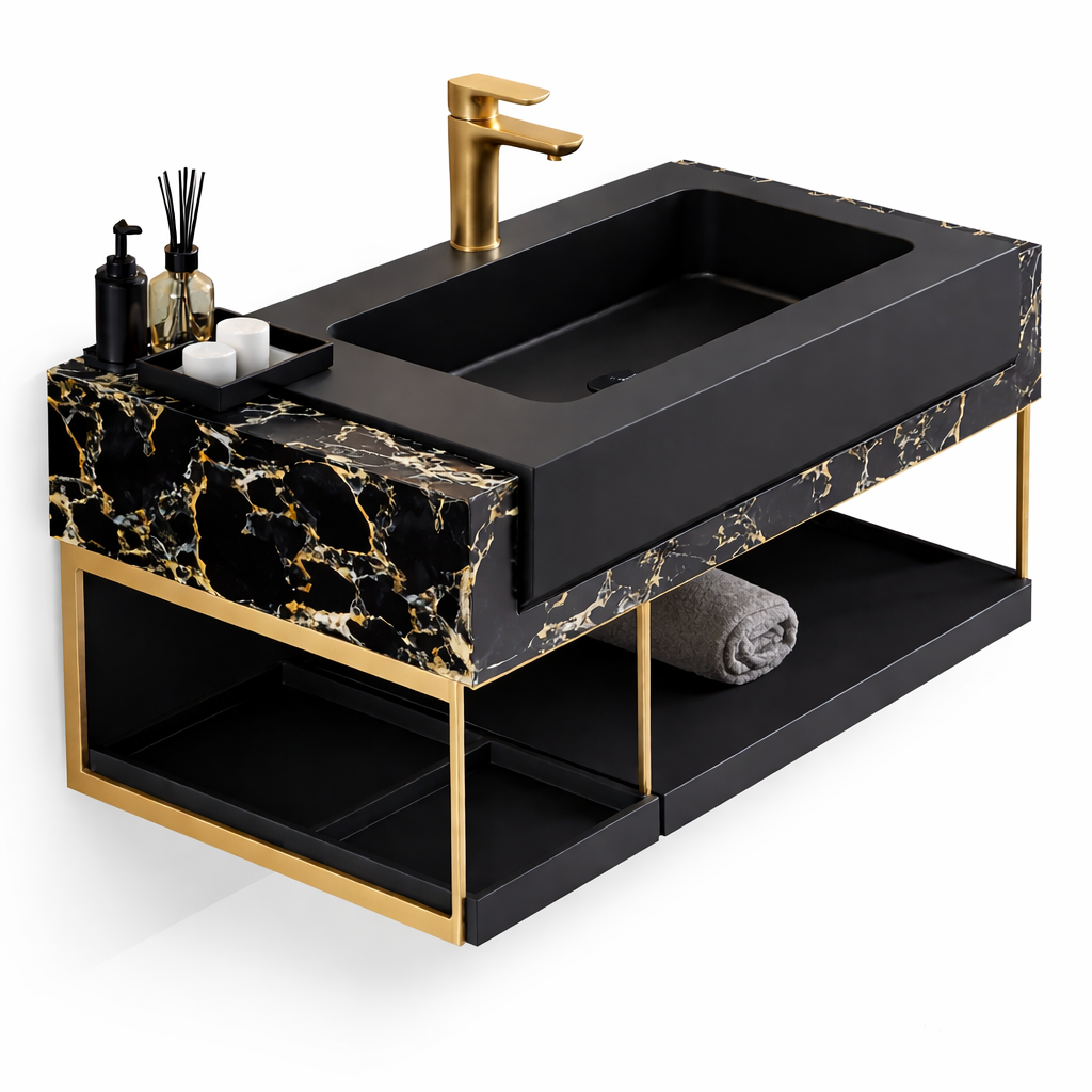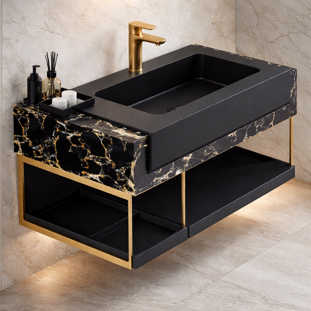 Blatul negru cu accente aurii transformă acest set într-un element central al băii. Robinetul auriu completează perfect estetica produsului, oferind un contrast elegant cu lavoarul negru.