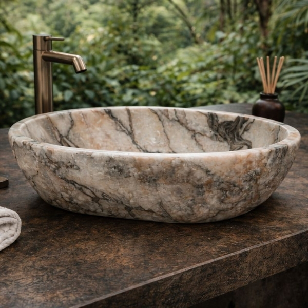 Lavoarul pe blat VELORE este conceput pentru spații în care materialul natural devine element central de design. Forma sa organică pune în valoare structura marmurei și creează un impact vizual autentic, cu aspect sculptural și expresiv.