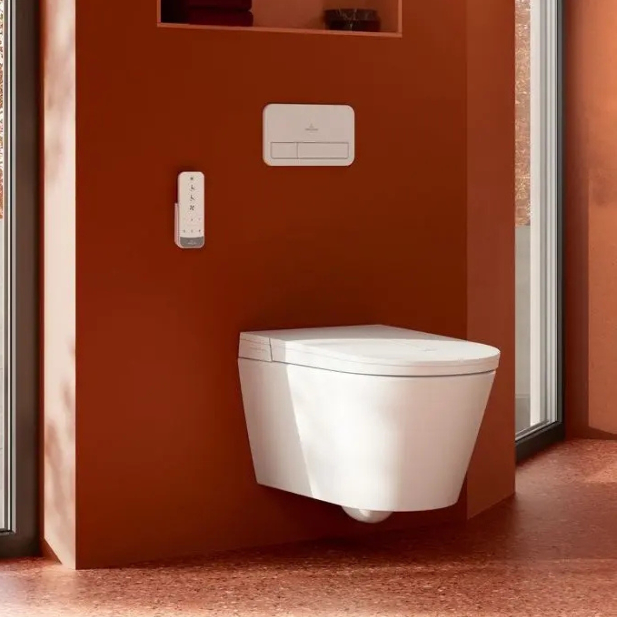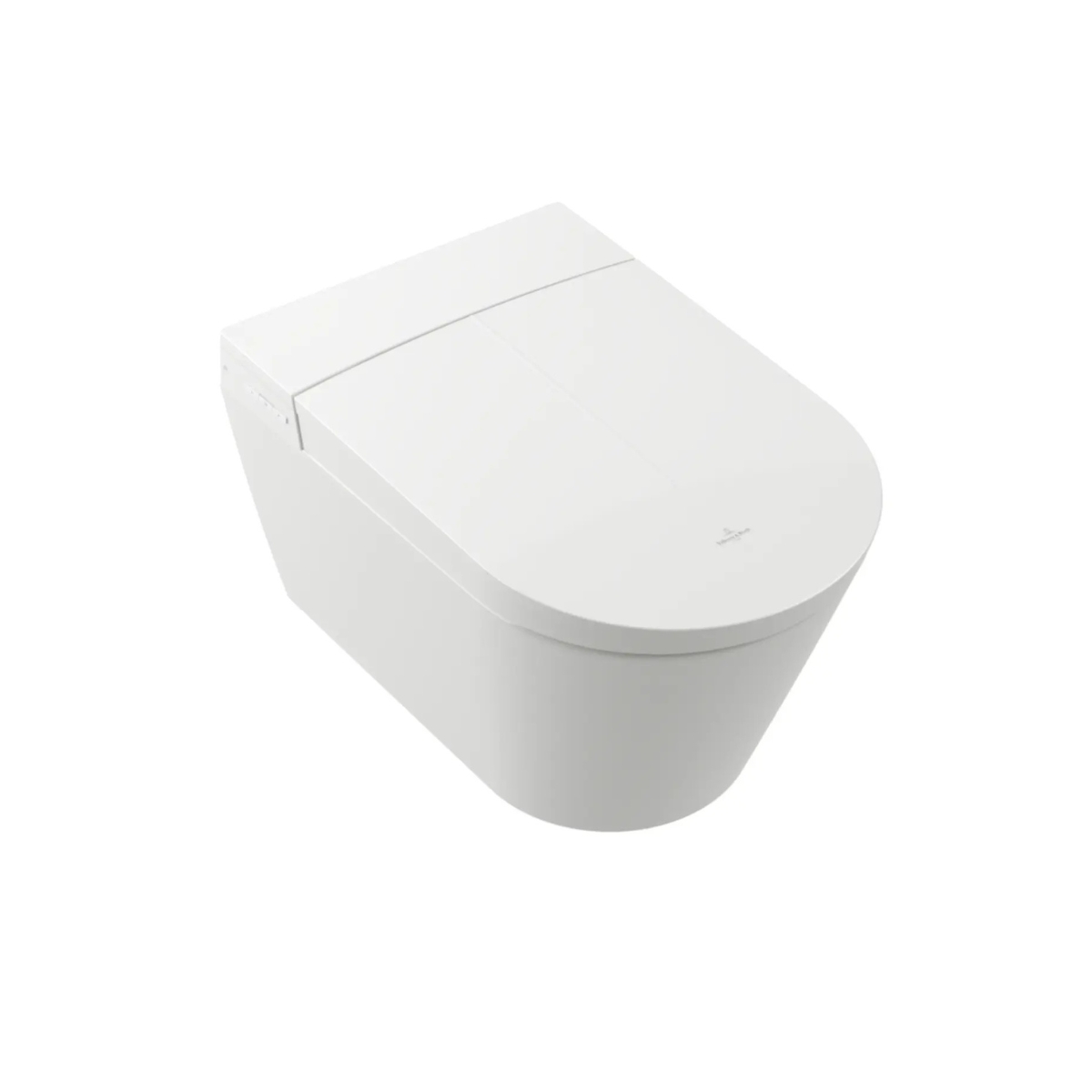 Vas toaletă inteligent Villeroy & Boch Tivo suspendat, cu funcții bideu, uscător, încălzire capac și control telecomandă, oferă igienă avansată și confort ridicat în baie modernă.