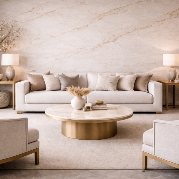 Aspectul inspirat din piatra naturală creează un ambient elegant și luminos: