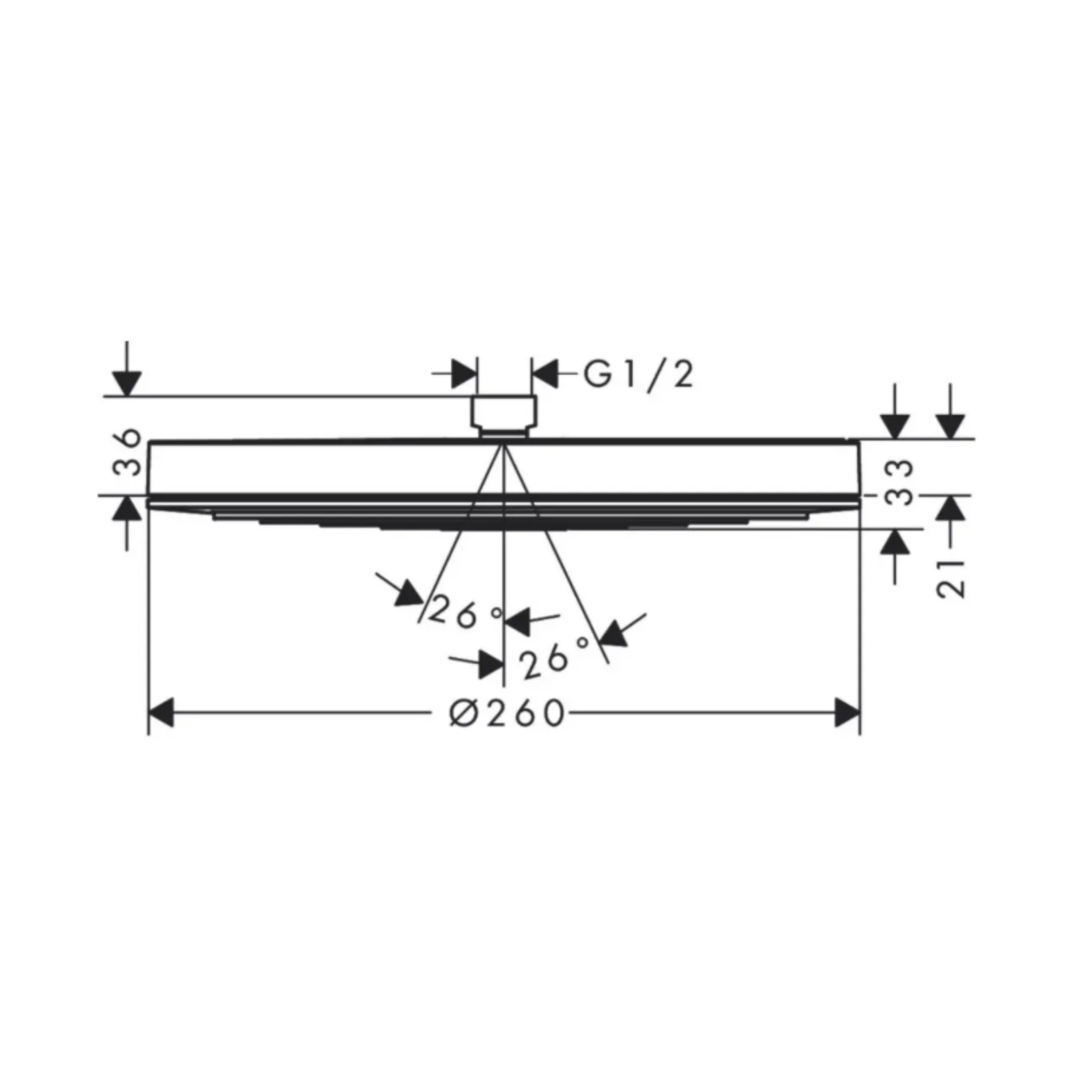 Capul de duș are un diametru de 260 mm, fiind parte a liniei XXL Performance, ce asigură o acoperire excelentă. Tipul de jet PowderRain oferă o experiență plăcută și revigorantă. Tehnologia QuickClean face curățarea foarte simplă, iar sistemul FastDrain permite golirea rapidă a dușului superior la o înclinare de 10°, prevenind acumularea apei. Adjustable Shower Head permite reglarea dușului la unghiul dorit, personalizând astfel experiența utilizatorului.