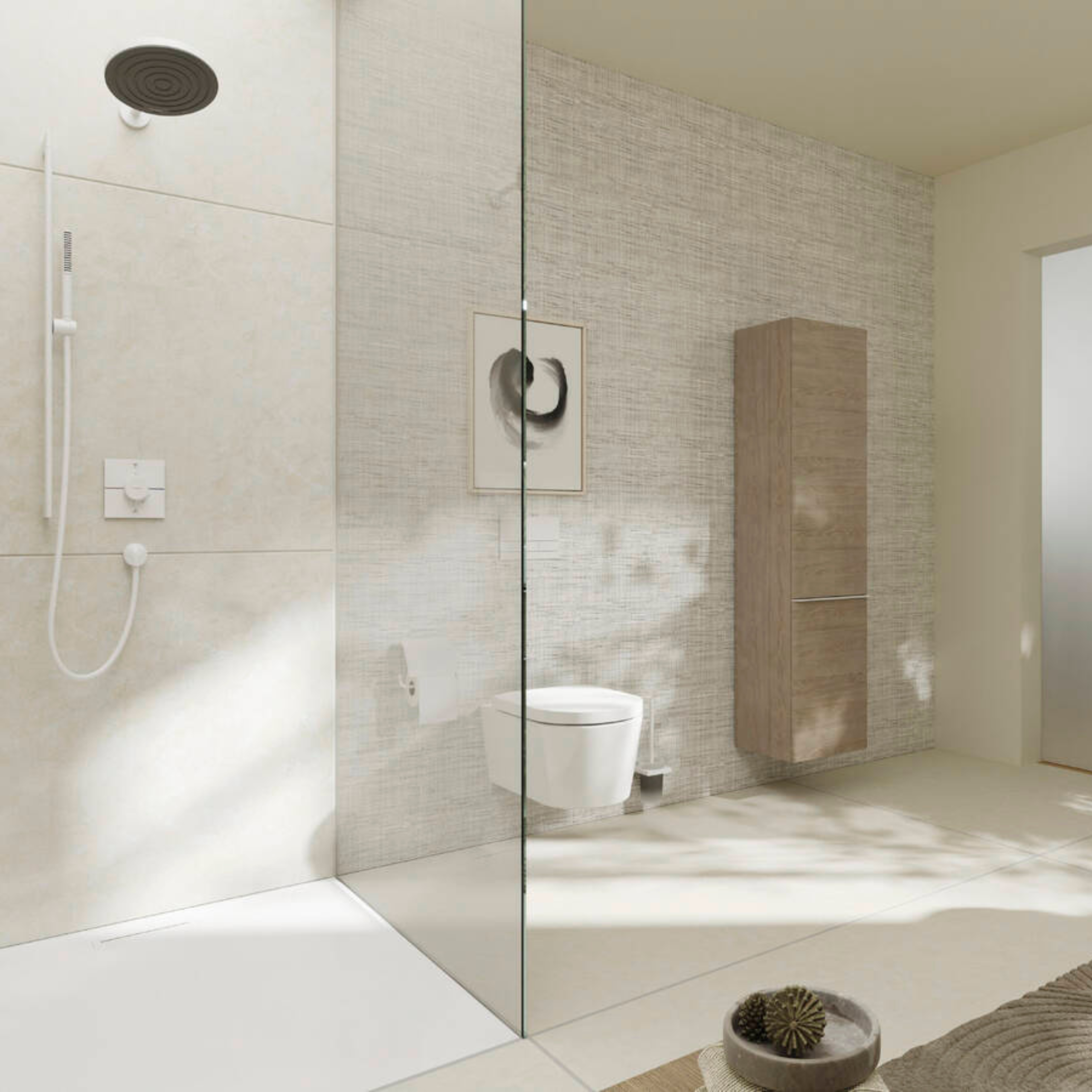 Palaria de duș fixă Hansgrohe Pulsify este perfectă pentru cei care caută un design modern și eficiență în utilizare. Cu un finisaj alb mat, această palarie este dotată cu un disc jeturi de culoare negru grafit, oferind un contrast elegant.