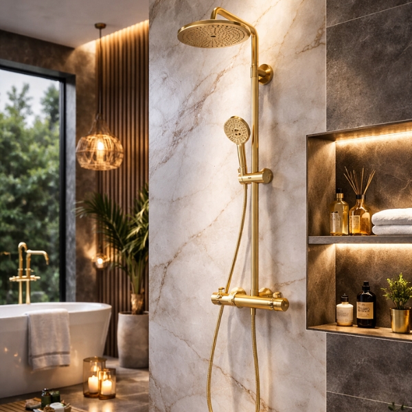 Finisajul bronz periat oferă un aspect cald și sofisticat, transformând sistemul de duș într-un element central al băii.